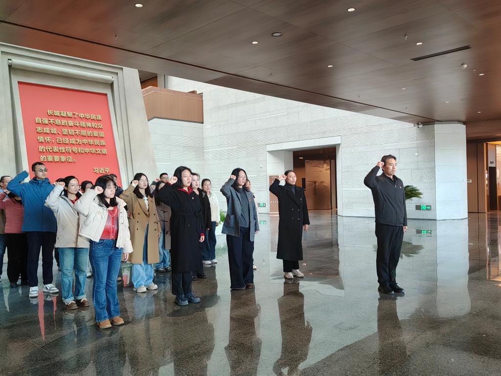 活动伊始,在庄严的氛围中,学院党委负责人带领全体党员,面向鲜红的党旗,高举右拳,重温入党誓词。“我志愿加入中国共产党……”铿锵有力的誓言在博物馆内久久回荡,声声入耳,字字千钧,激励着每一位党员不忘初心、牢记使命,永葆对党的赤诚忠心。