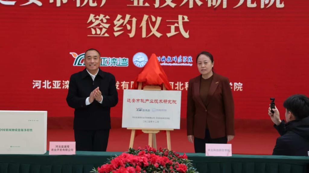张明莉与陈国共同为迁安市桃产业技术研究院揭牌